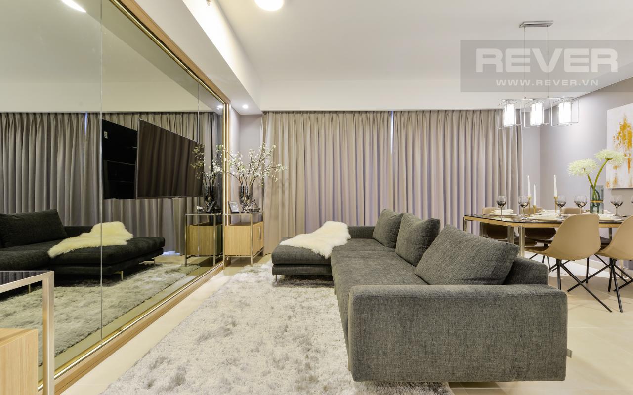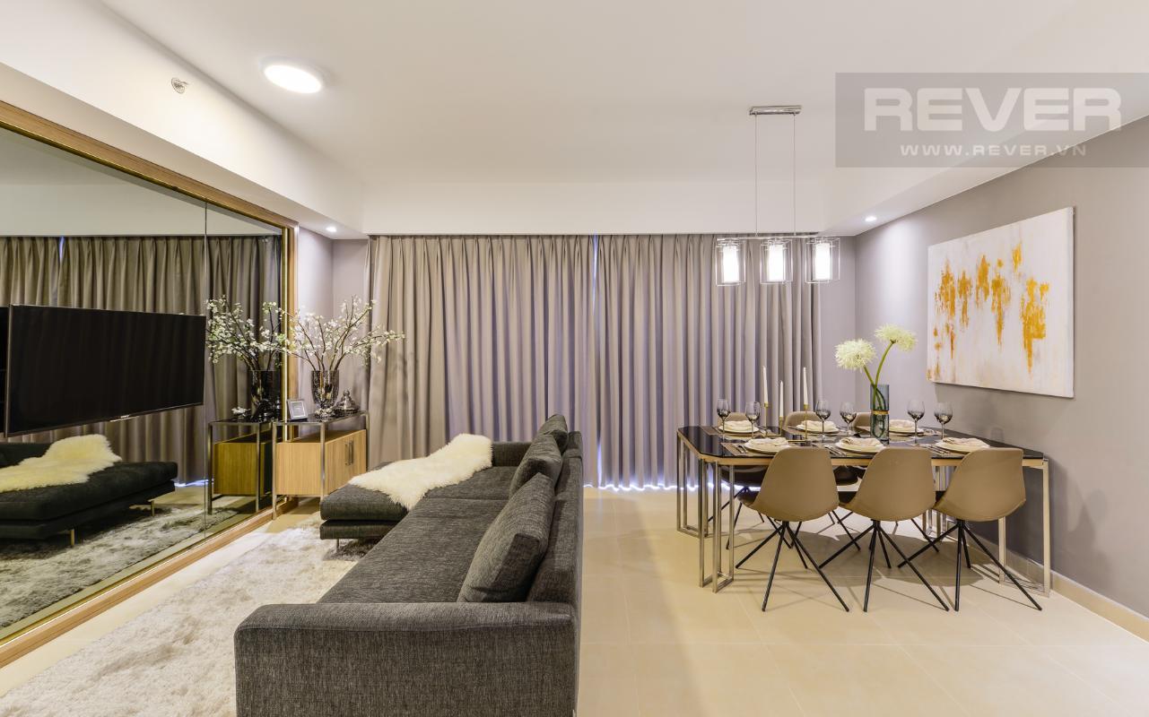 Phòng khách lắp đặt cửa kính lùa lớn dẫn sáng tự nhiên. Kệ TV với những đường thẳng khỏe khoắn, bàn trà bắt mắt với sự kết hợp hài hòa giữa mặt bàn gỗ và chân inox được phối đồng điệu ghế sofa màu cam. Điểm xuyến cho không gian phòng khách thêm phần sinh động là chiếc tủ thấp mang nét truyền thống. Dẫn thông với phòng khách là khu vực bàn ăn đã được gia chủ khéo léo pha trộn màu sắc để mang đến sự sinh động nhưng không làm phá vỡ khoảng không gian ấm cúng của những bữa cơm thân mật. Những món nội thất cao cấp và bài trí phá cách này khiến căn hộ sang trọng và thẩm mỹ hơn.
