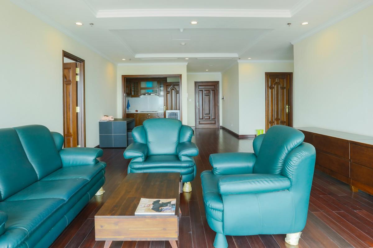 Căn hộ có cửa hướng Nam, diện tích sử dụng 157m2 với kết cấu 3 phòng ngủ được gia chủ thiết kế theo phong cách đương đại mang đến sự sang trọng, rộng rãi và thoáng đãng nhất. Màu nâu đặc trưng của sàn gỗ, bàn trà, tủ thấp, tủ kệ nơi gian bếp cùng những ô cửa lớn,… được sử dụng tô điểm sự sang trọng, ấm cúng cho không gian thoáng đãng và rộng rãi nhờ vào sắc màu sáng tổng thể của căn hộ với trần trắng, tường vàng nhạt.